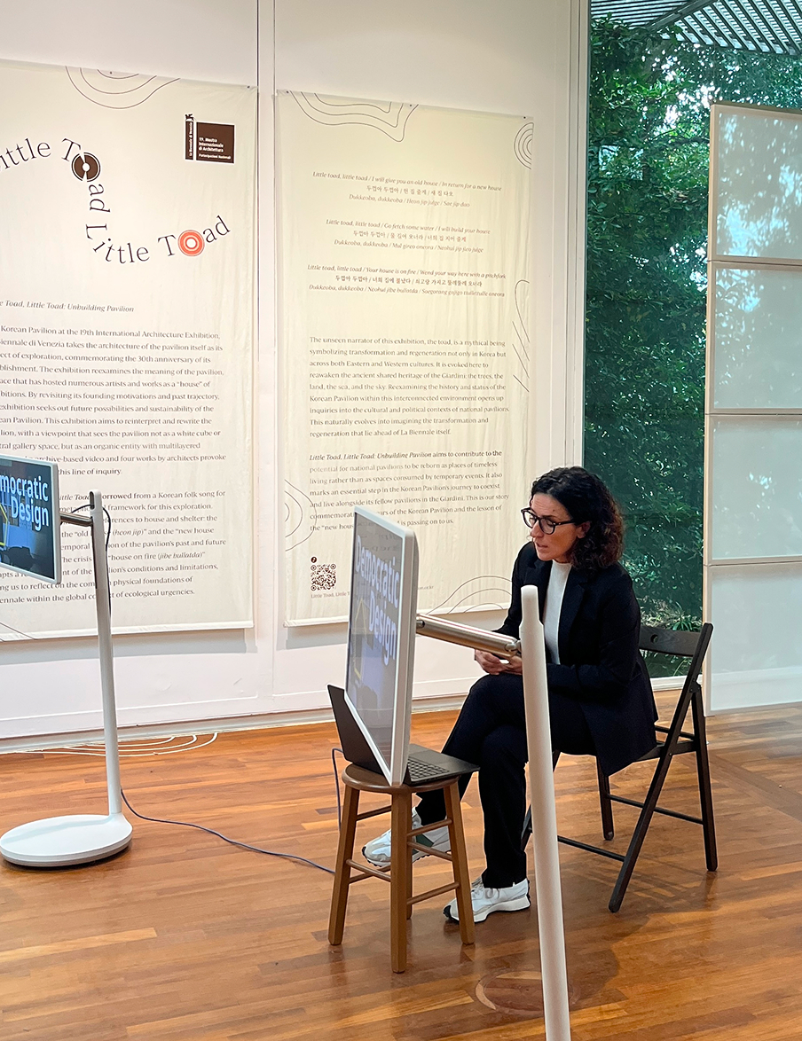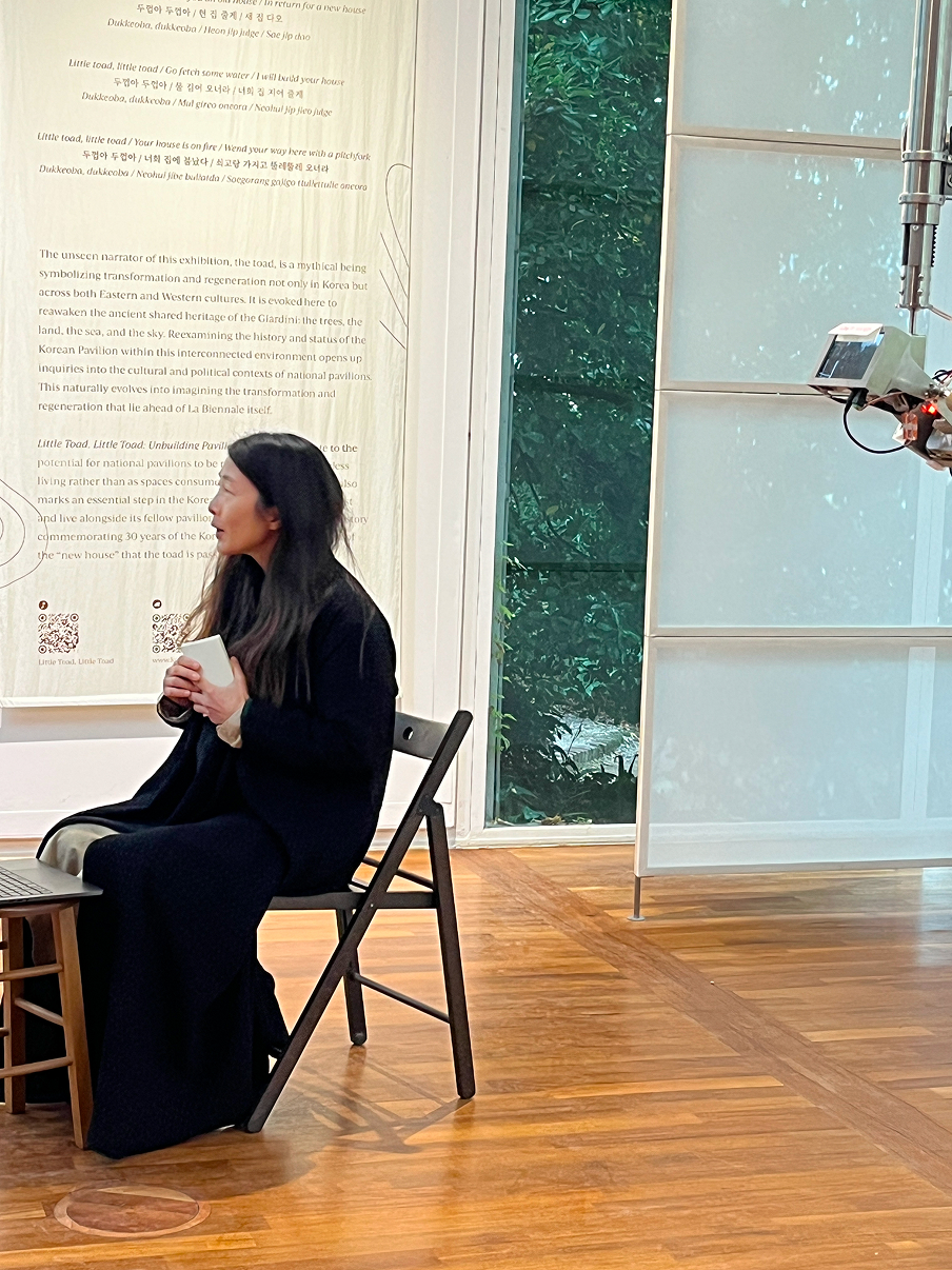 마지막으로 김희정(2025 베니스비엔날레 한국관 공동 예술감독)은 ‘Architecture AMONG OTHERS’를 주제로, 한국관이 자리한 자르디니의 역사적, 정치적, 생태적 층위를 짚으며 한국관 전시가 단일한 국가적 서사를 넘어 다양한 시간과 존재들이 공존하는 영토임을 설명했습니다. «두껍아 두껍아: 집의 시간»이 집을 기억과 반복, 소멸과 축적이 겹쳐진 시간의 공간으로 바라보고 있음을 다시 환기하며, 지속가능성을 물리적 보존이 아닌 관계의 지속으로 논의했습니다.